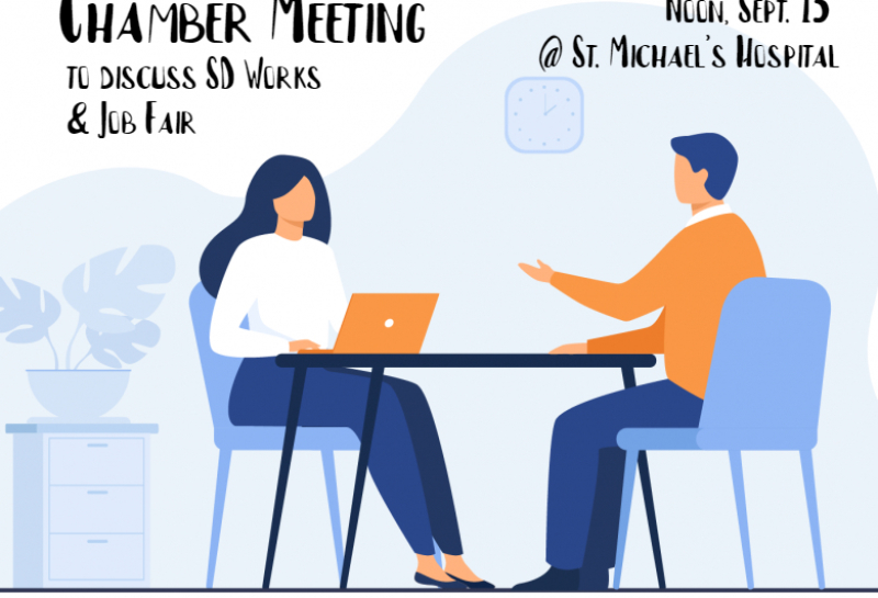 Join us at noon on Tuesday, September 12, 2022 at St. Michael's Hospital Avera for a Chamber meeting to discuss the creation of a local job fair and how to utilize the SD Works website.